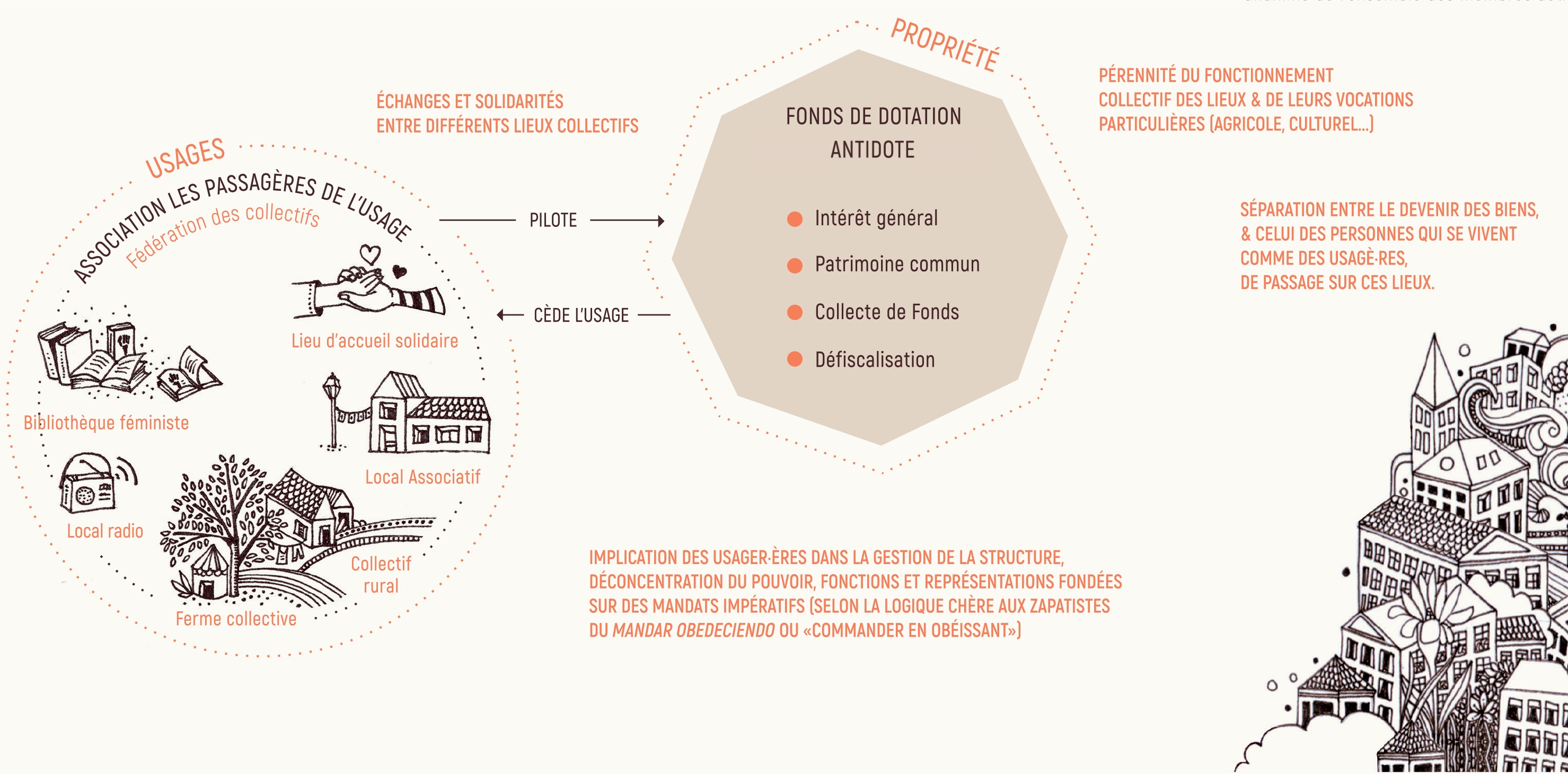 Le fons de dotation Antidote se donne ainsi pour but d'acquérir ou d'accueillir des donations ou legs de lieux à usages collectifs mais également de lever les fonds nécessaires. Il est donc à la fois un outil de collecte financière et de gestion immobilière.