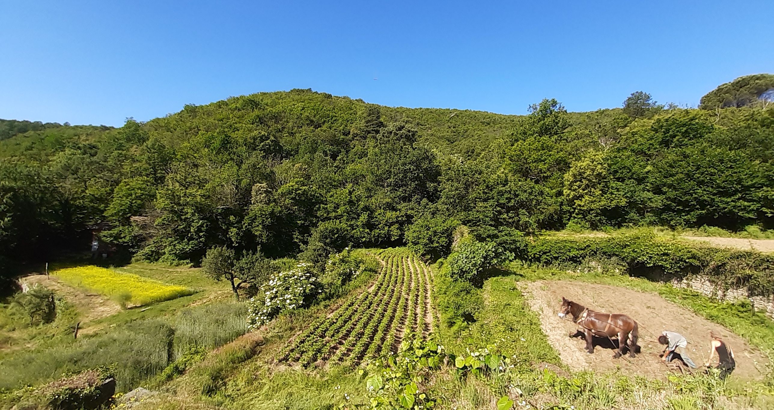 Nous pratiquons du maraîchage en traction animale afin de nourrir les habitant.es et toutes les personnes accueillies sur le lieu. En parallèle, la culture et la transformation de châtaignes est l'activité économique principale qui permet de faire vivre l'association.